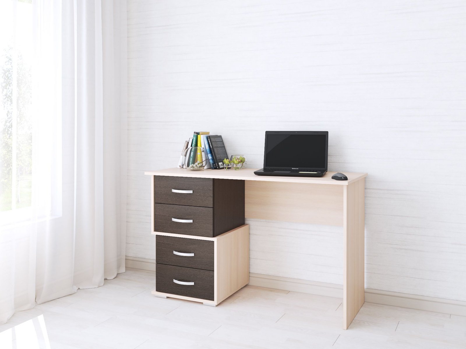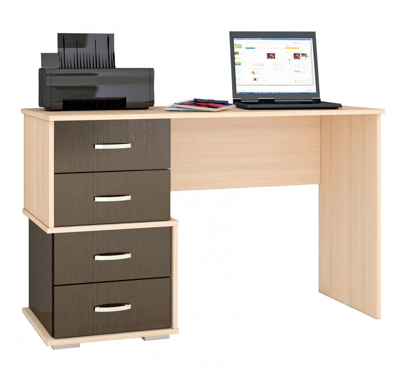 Ищете недорогой письменный стол необычной формы? Обратите внимание на модель Сити-2. Несмотря на популярный декор венге/дуб молочный, стол отличается от аналогов конструкцией встроенной тумбы с ящиками. Вы сможете организовать не только функциональное и комфортное для ежедневной работы, но и визуально привлекательное рабочее место. Четыре выдвижных ящика оснащены роликовыми направляющими.Ручки пластиковые цвета "металлик".